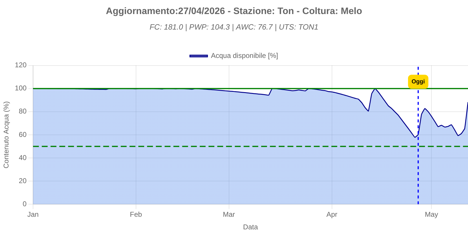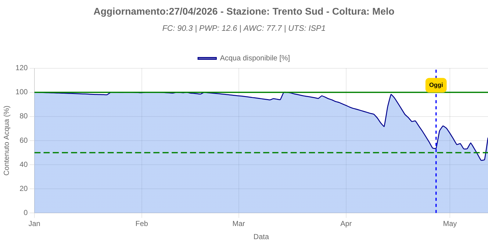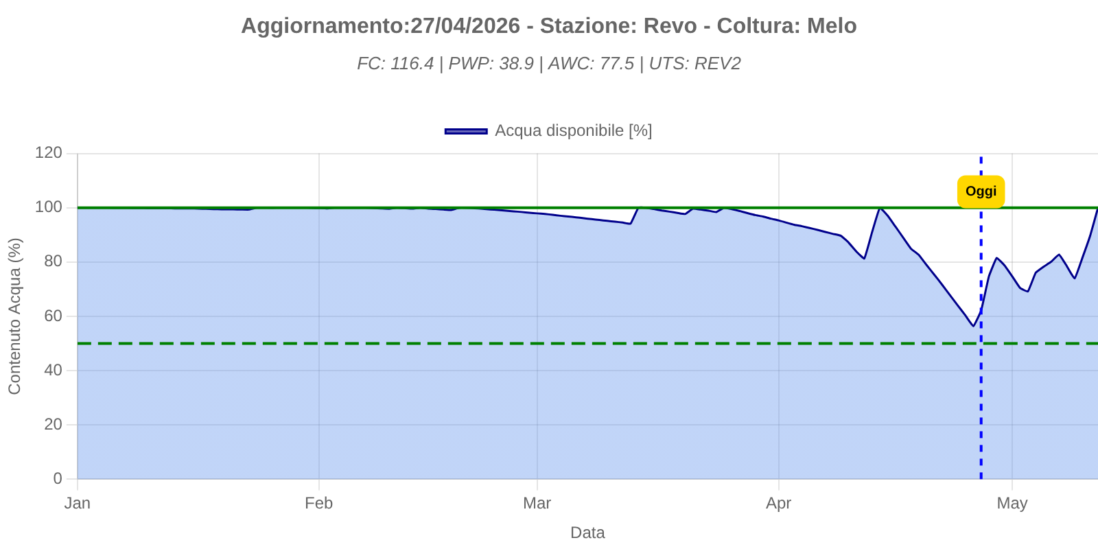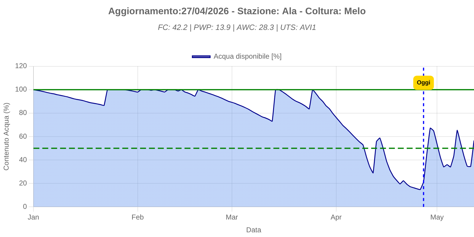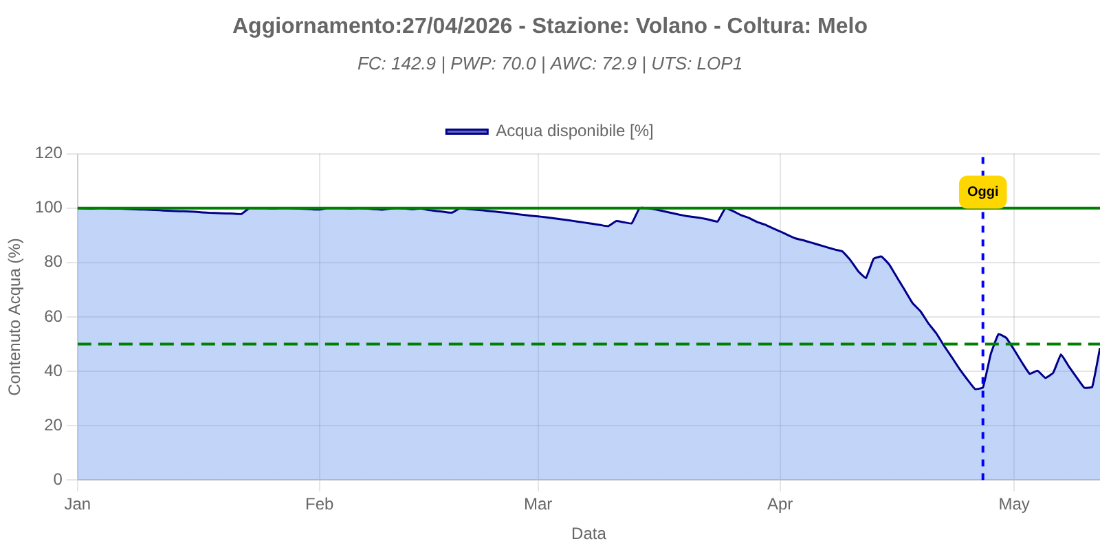 e utilizza, oltre ai dati meteorologici, anche le caratteristiche fisiche del suolo Per ogni stazione sono presenti due grafici che rappresentano la disponibilità d'acqua per due colture diverse (melo e vite)