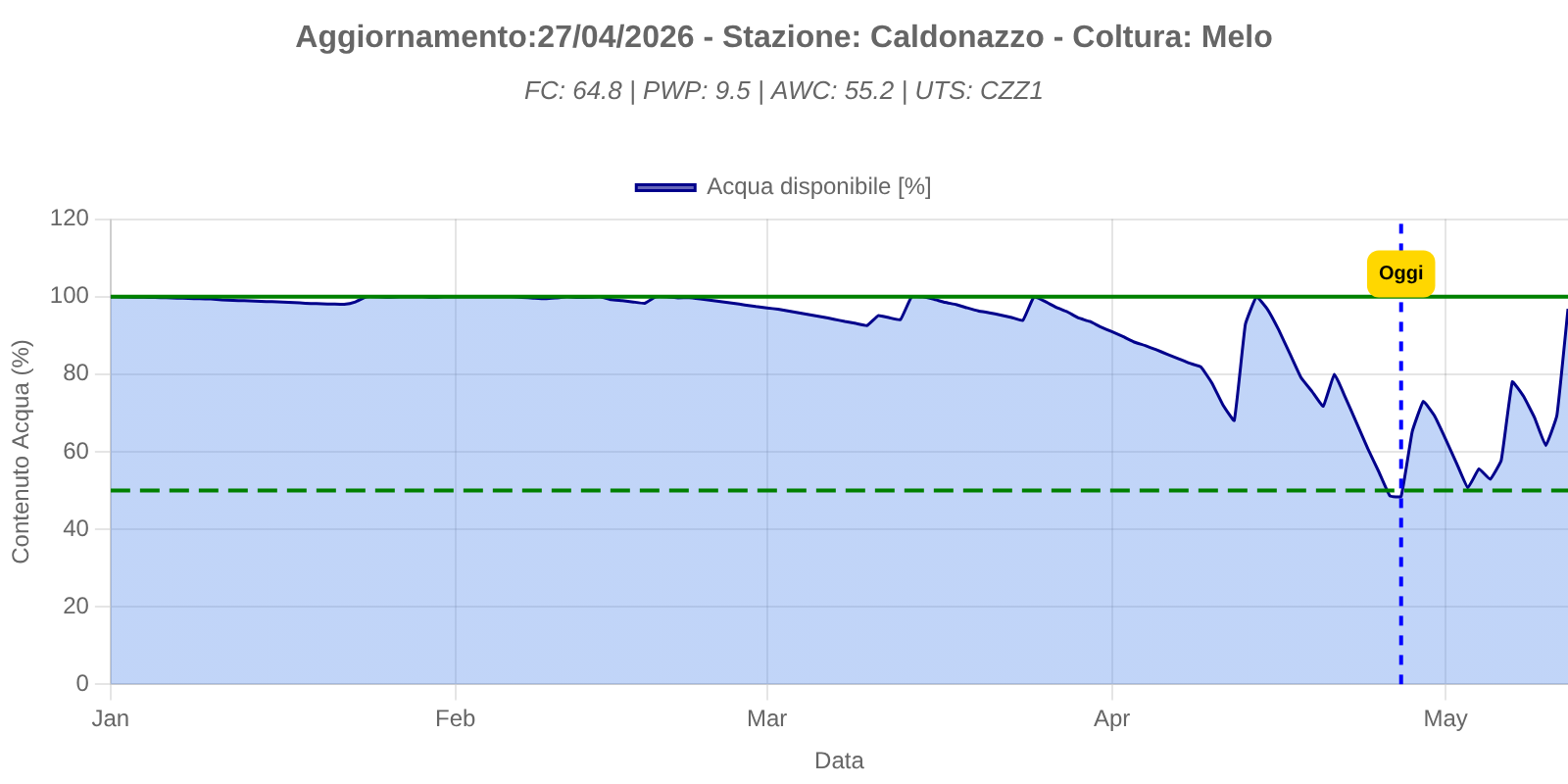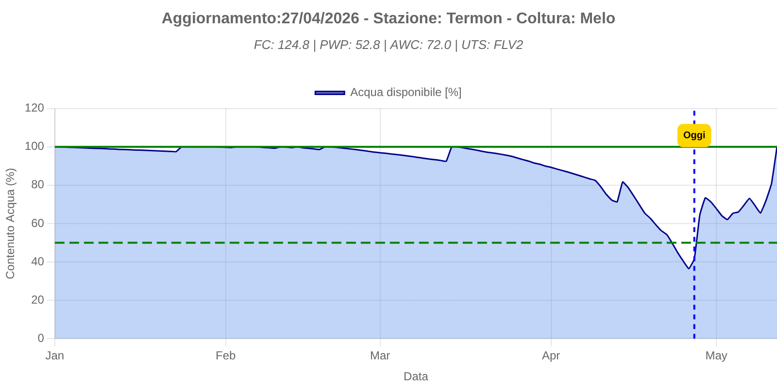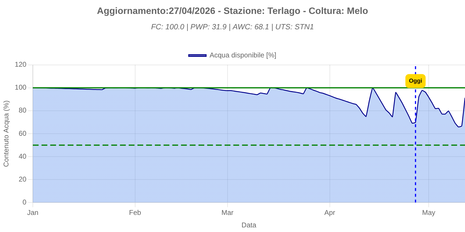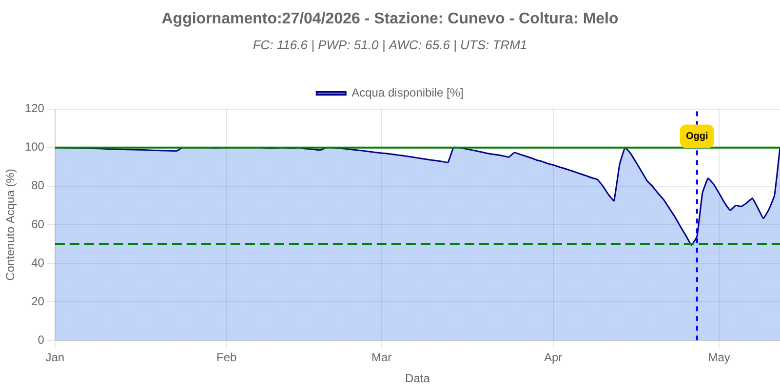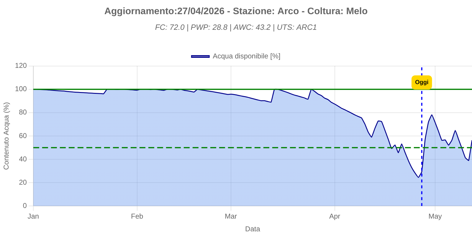 e utilizza, oltre ai dati meteorologici, anche le caratteristiche fisiche del suolo Per ogni stazione sono presenti due grafici che rappresentano la disponibilità d'acqua per due colture diverse (melo e vite)