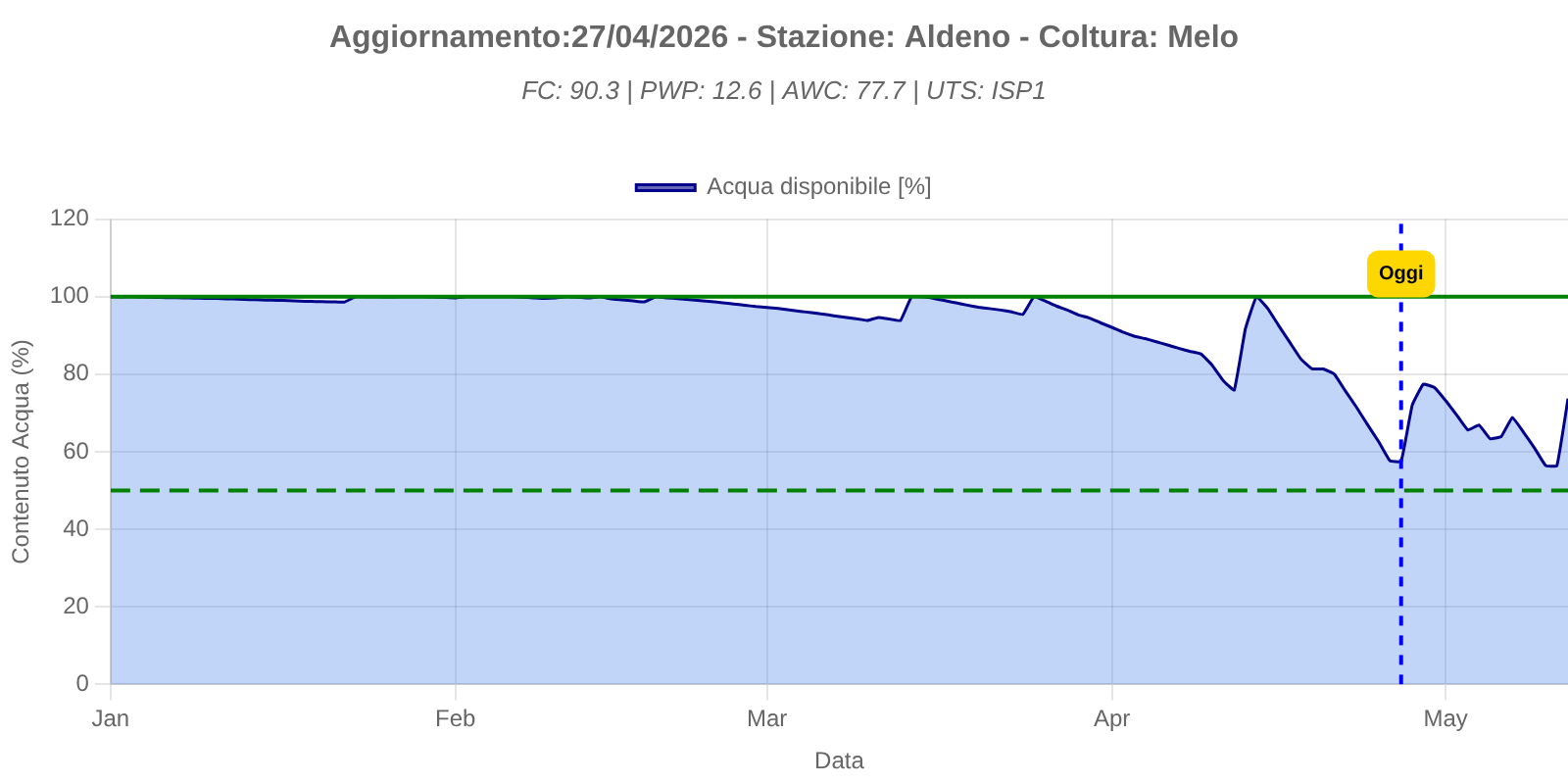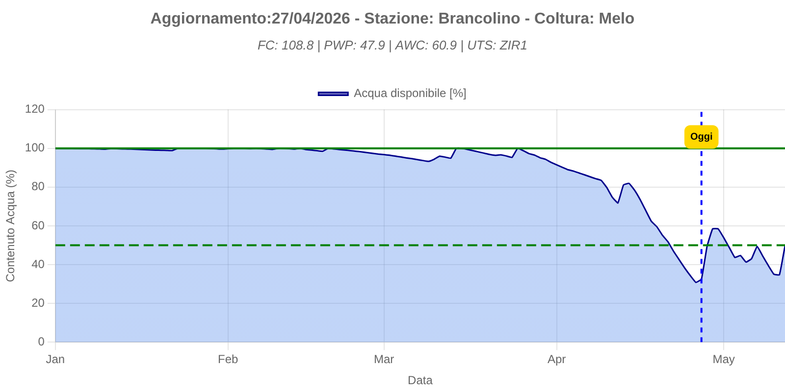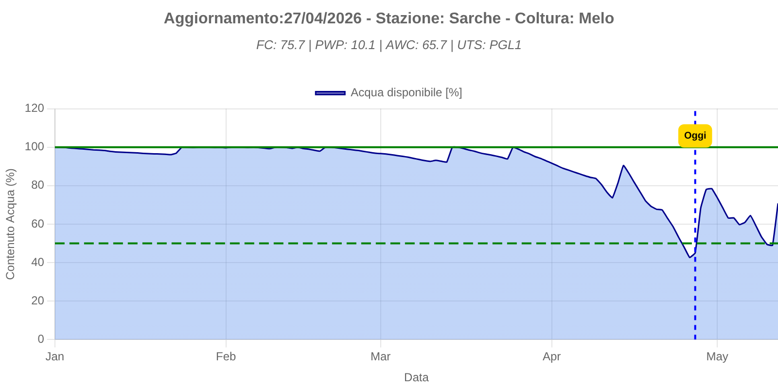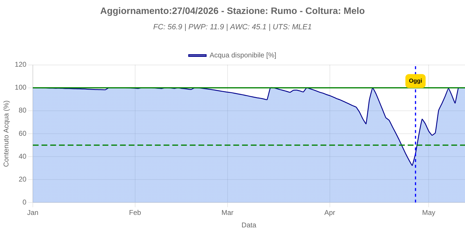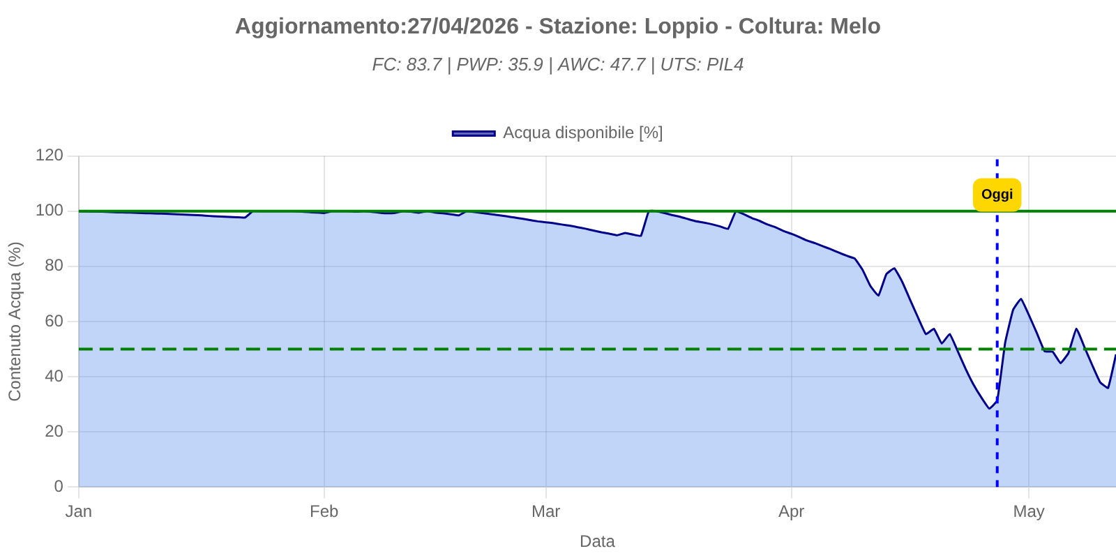 e utilizza, oltre ai dati meteorologici, anche le caratteristiche fisiche del suolo Per ogni stazione sono presenti due grafici che rappresentano la disponibilità d'acqua per due colture diverse (melo e vite)