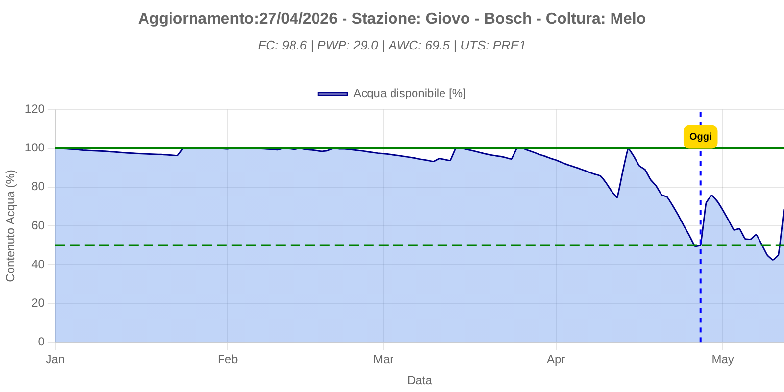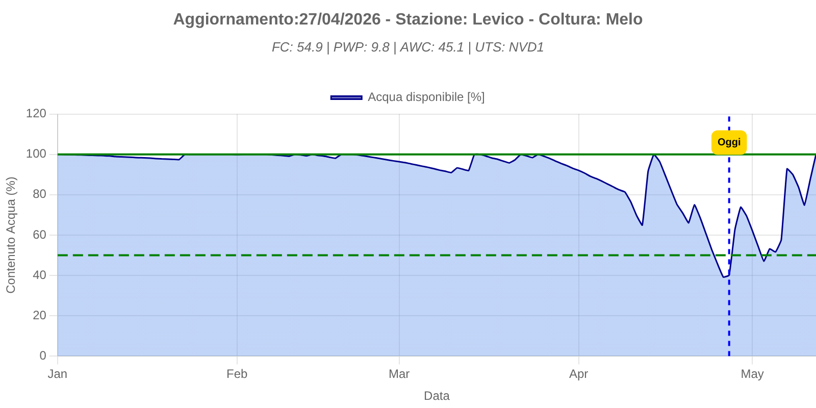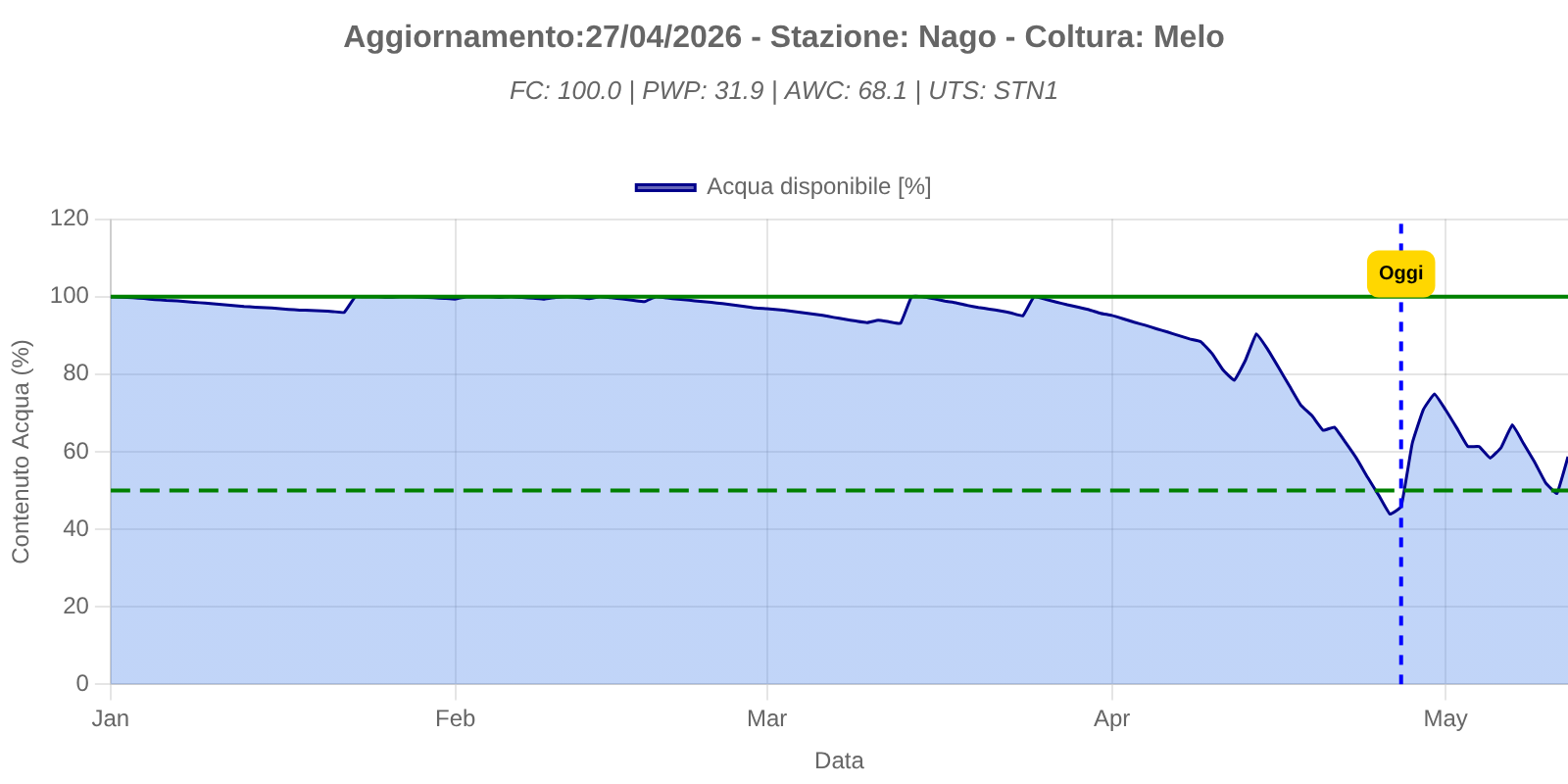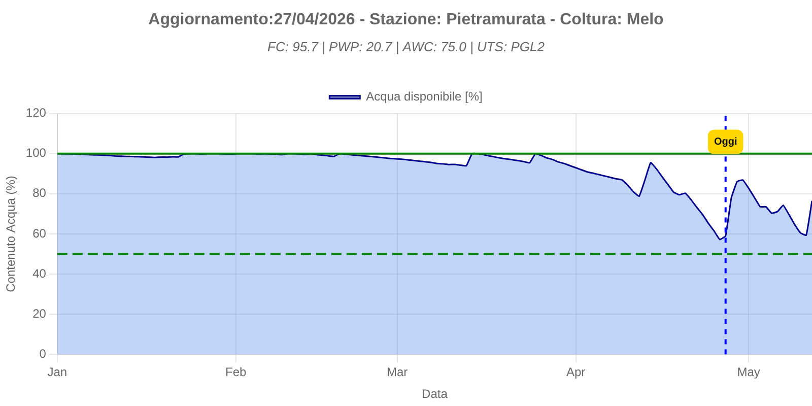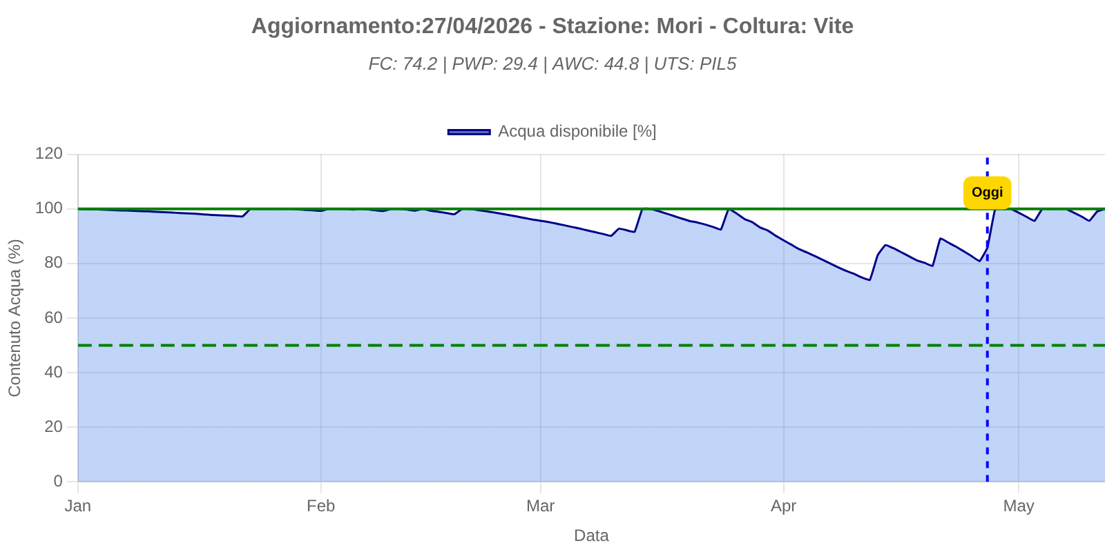 e utilizza, oltre ai dati meteorologici, anche le caratteristiche fisiche del suolo Per ogni stazione sono presenti due grafici che rappresentano la disponibilità d'acqua per due colture diverse (melo e vite)