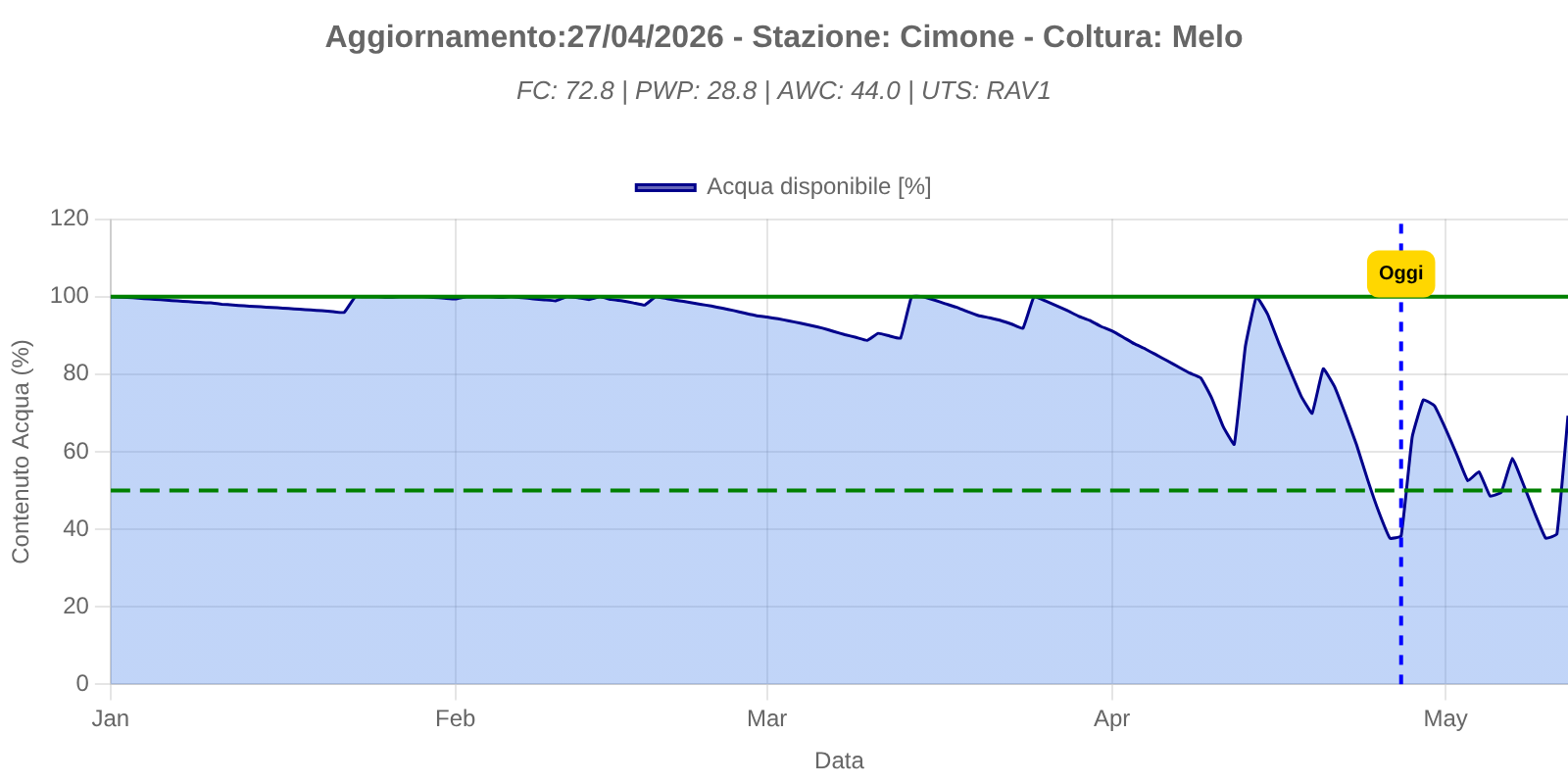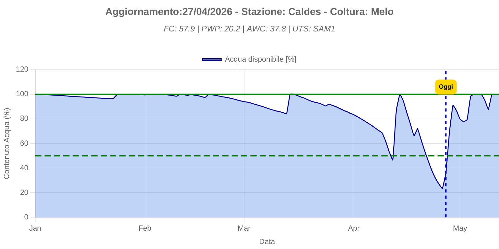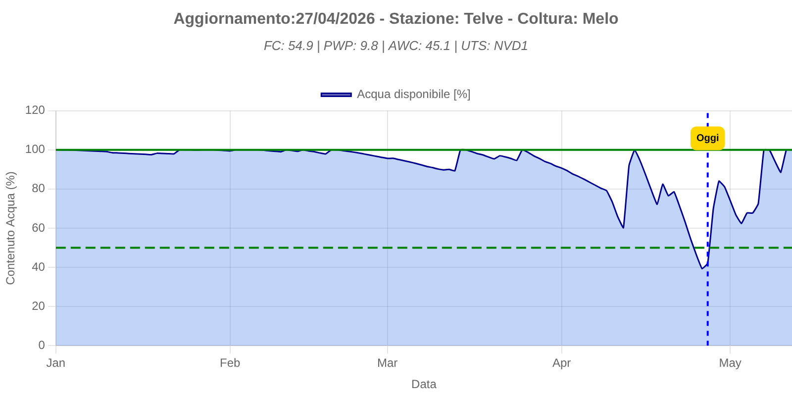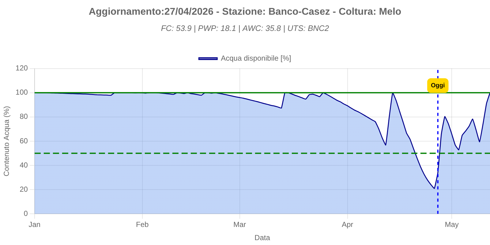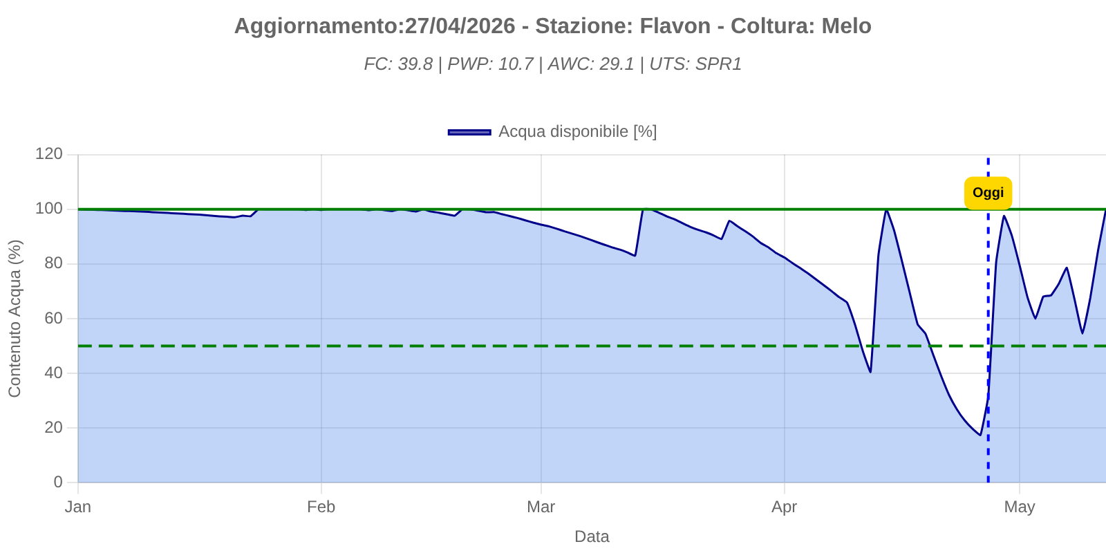 e utilizza, oltre ai dati meteorologici, anche le caratteristiche fisiche del suolo Per ogni stazione sono presenti due grafici che rappresentano la disponibilità d'acqua per due colture diverse (melo e vite)