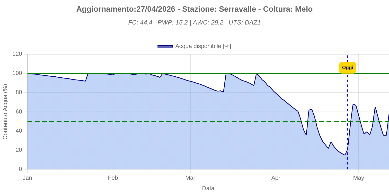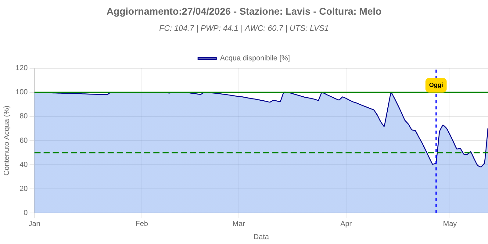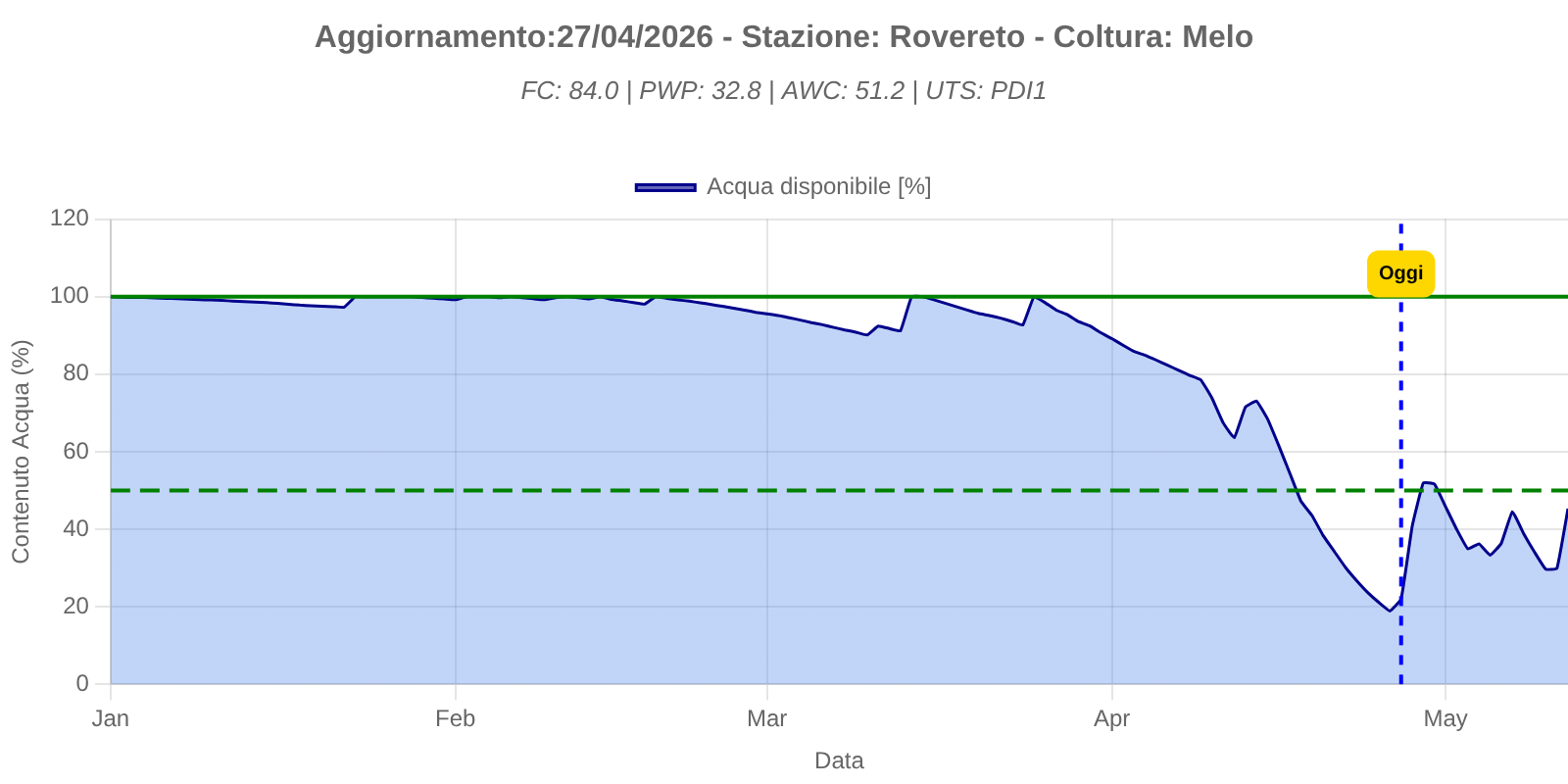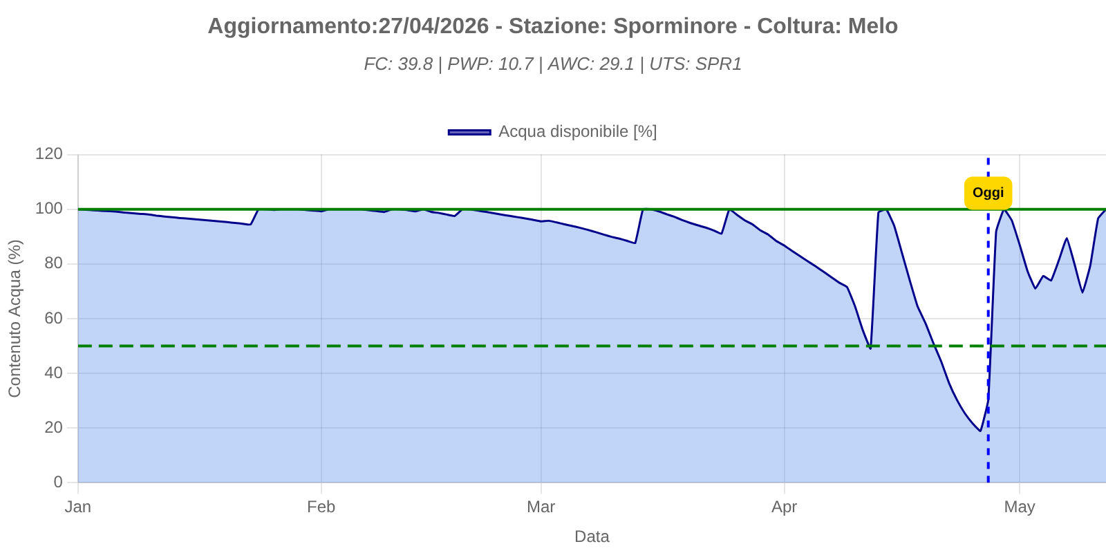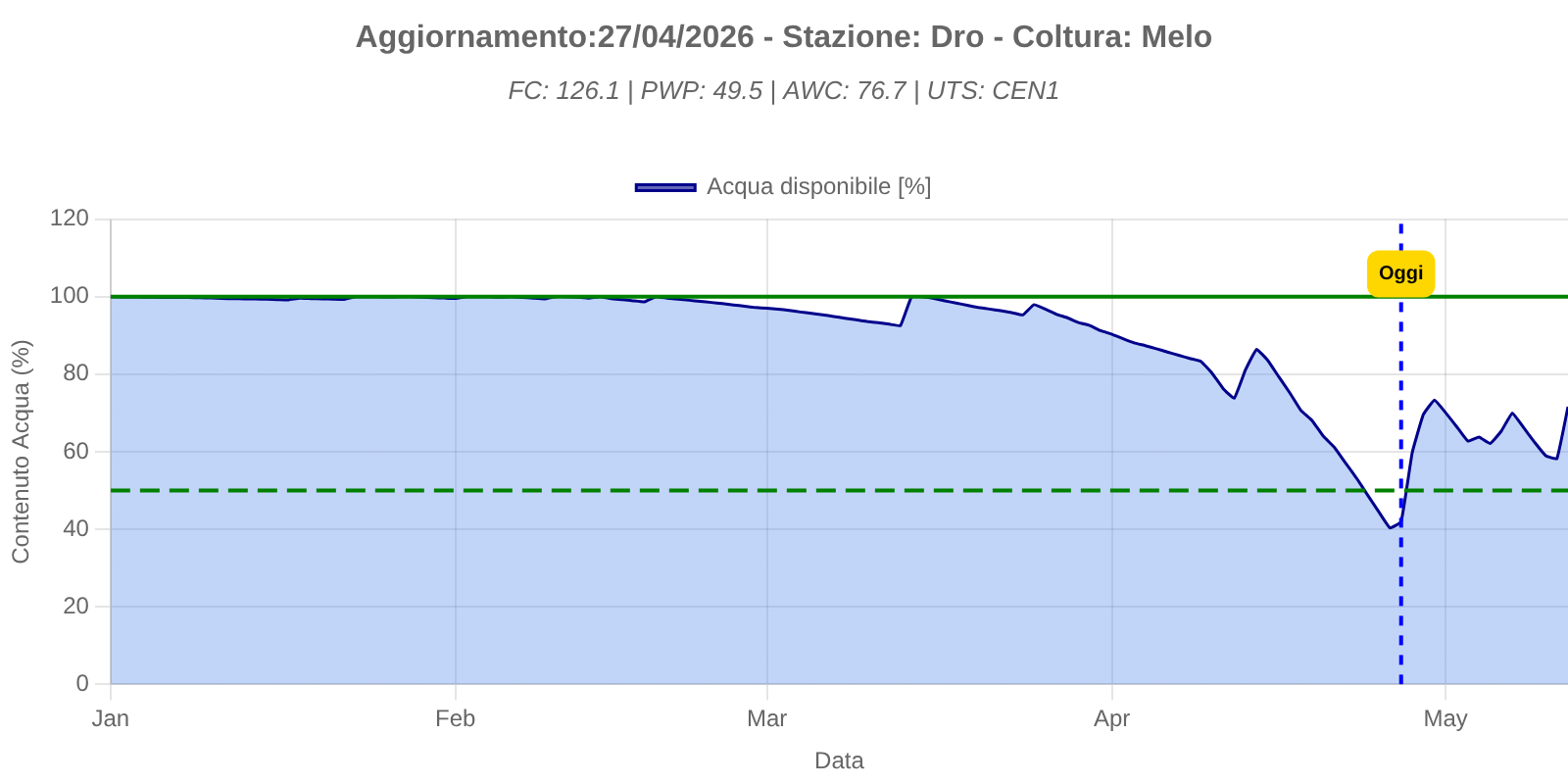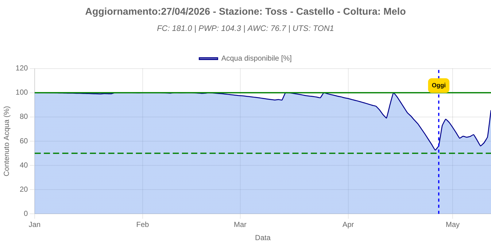 e utilizza, oltre ai dati meteorologici, anche le caratteristiche fisiche del suolo Per ogni stazione sono presenti due grafici che rappresentano la disponibilità d'acqua per due colture diverse (melo e vite)