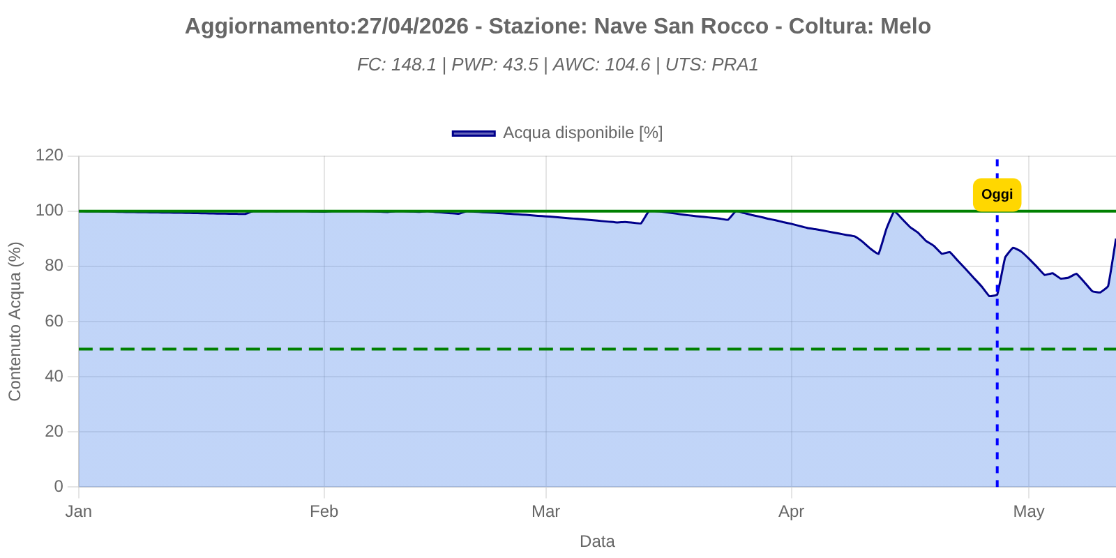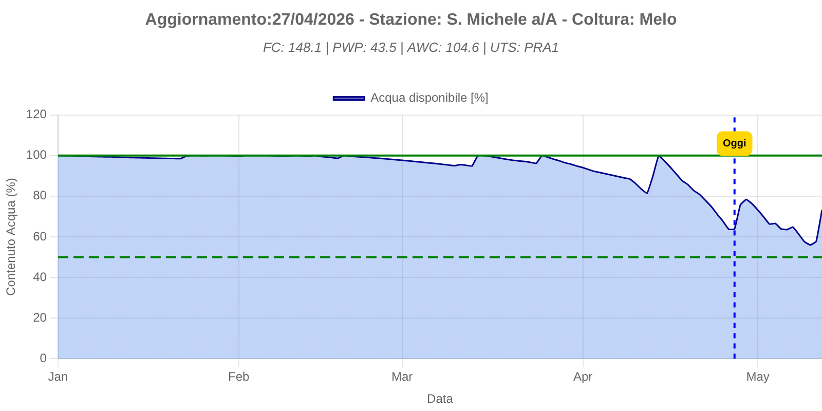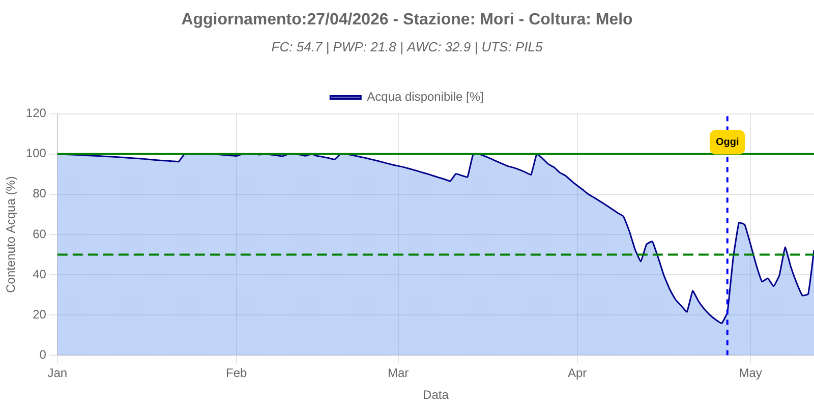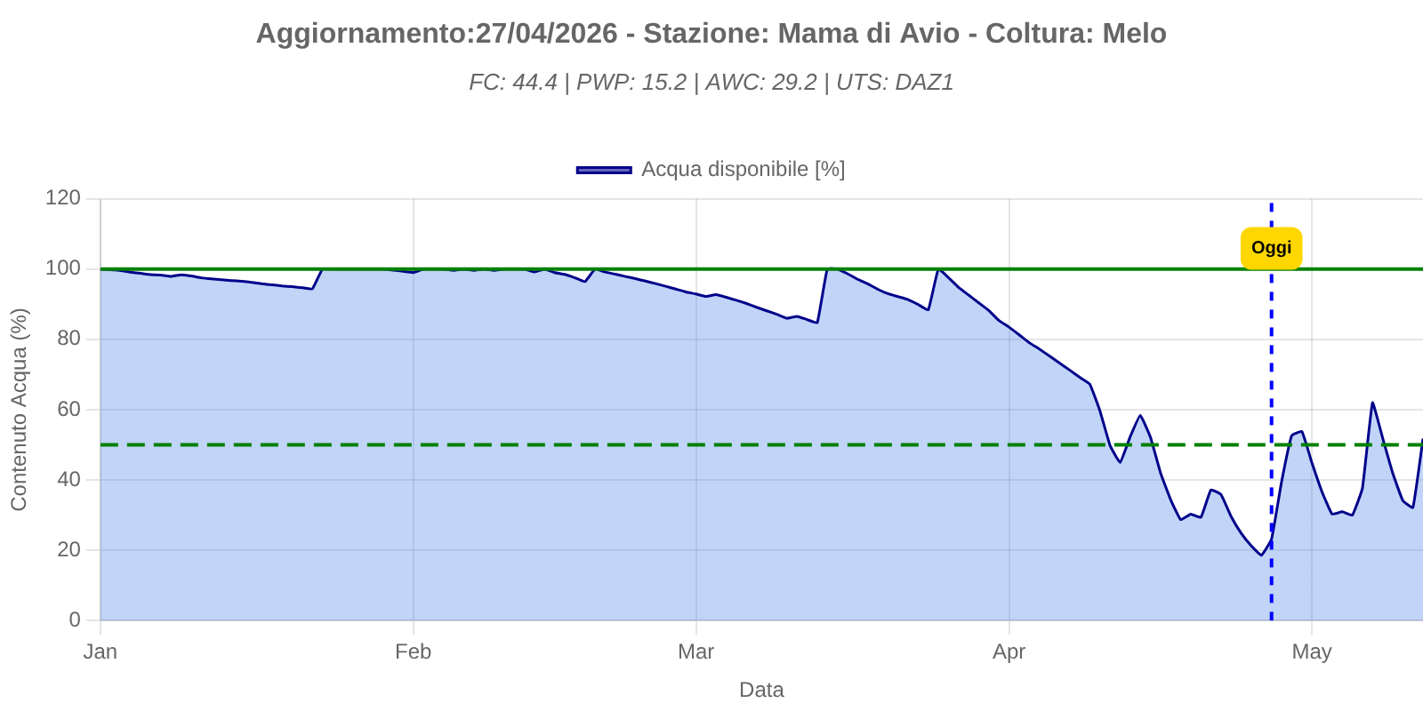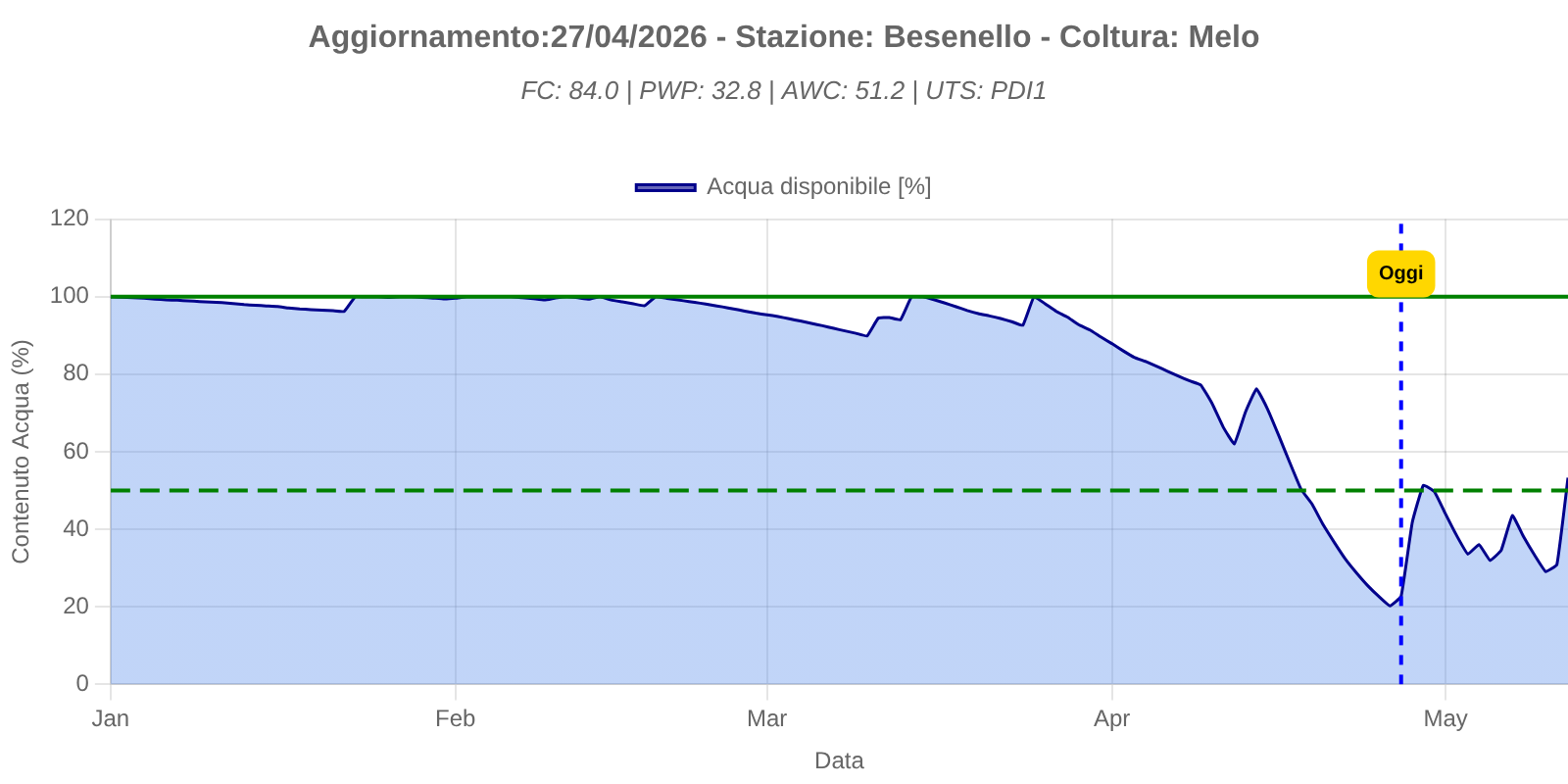 e utilizza, oltre ai dati meteorologici, anche le caratteristiche fisiche del suolo Per ogni stazione sono presenti due grafici che rappresentano la disponibilità d'acqua per due colture diverse (melo e vite)