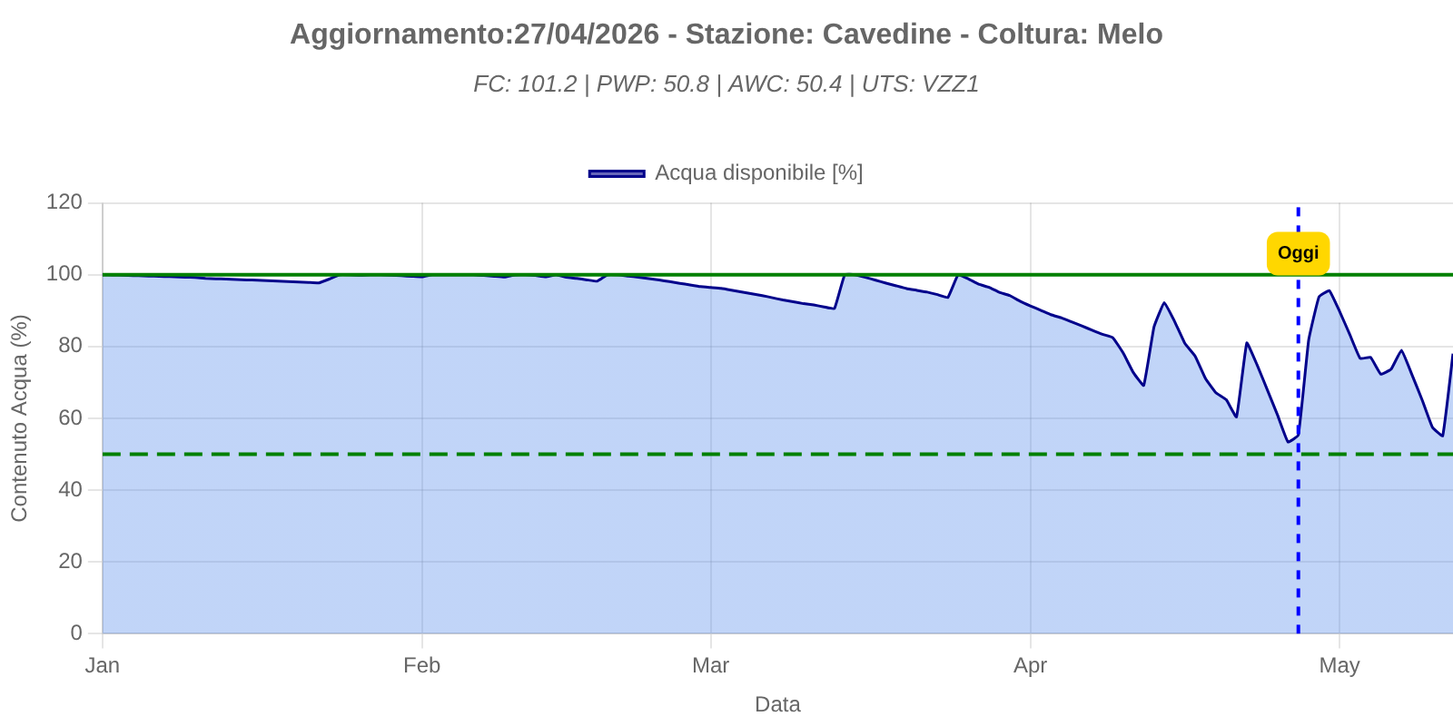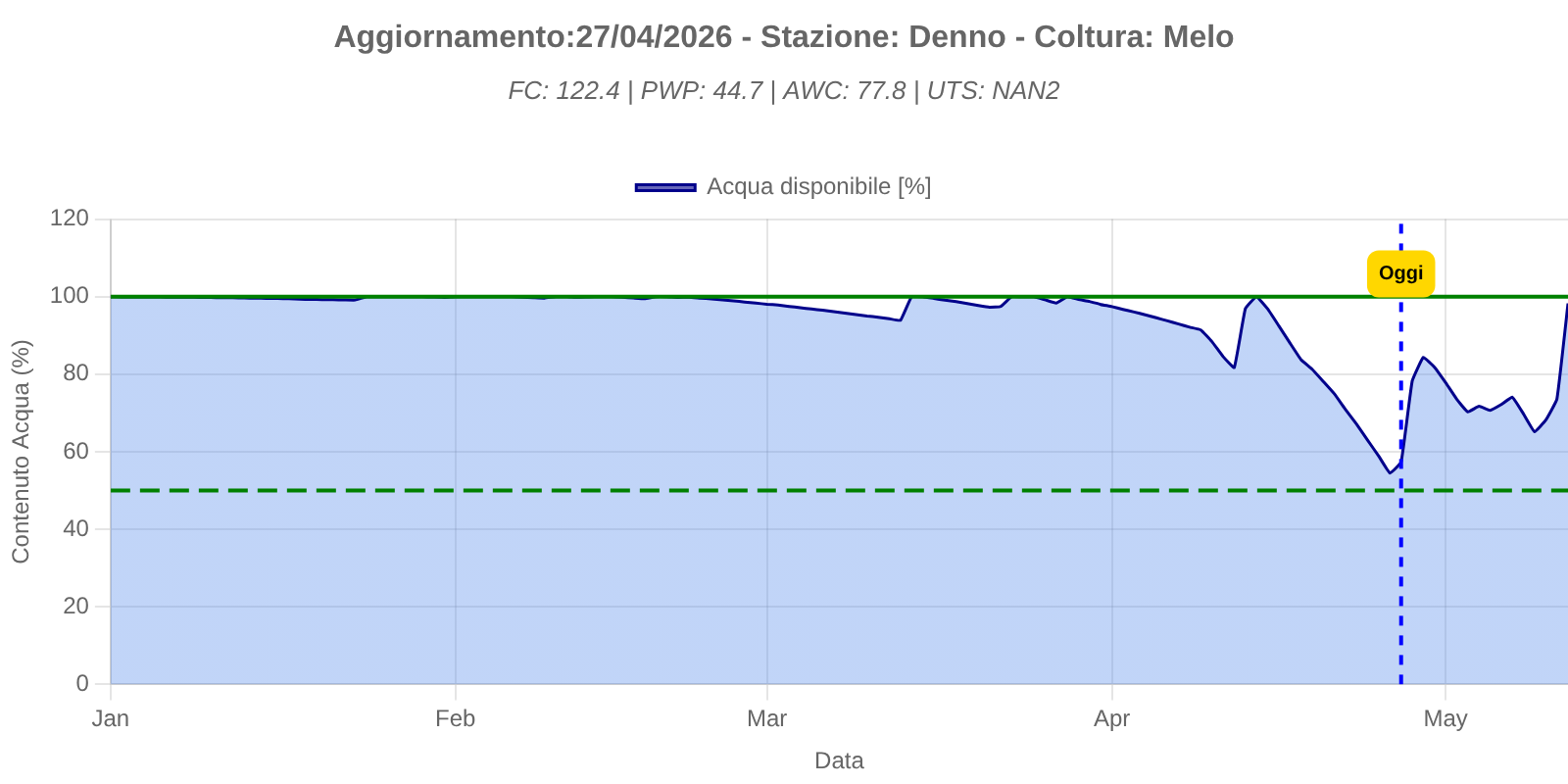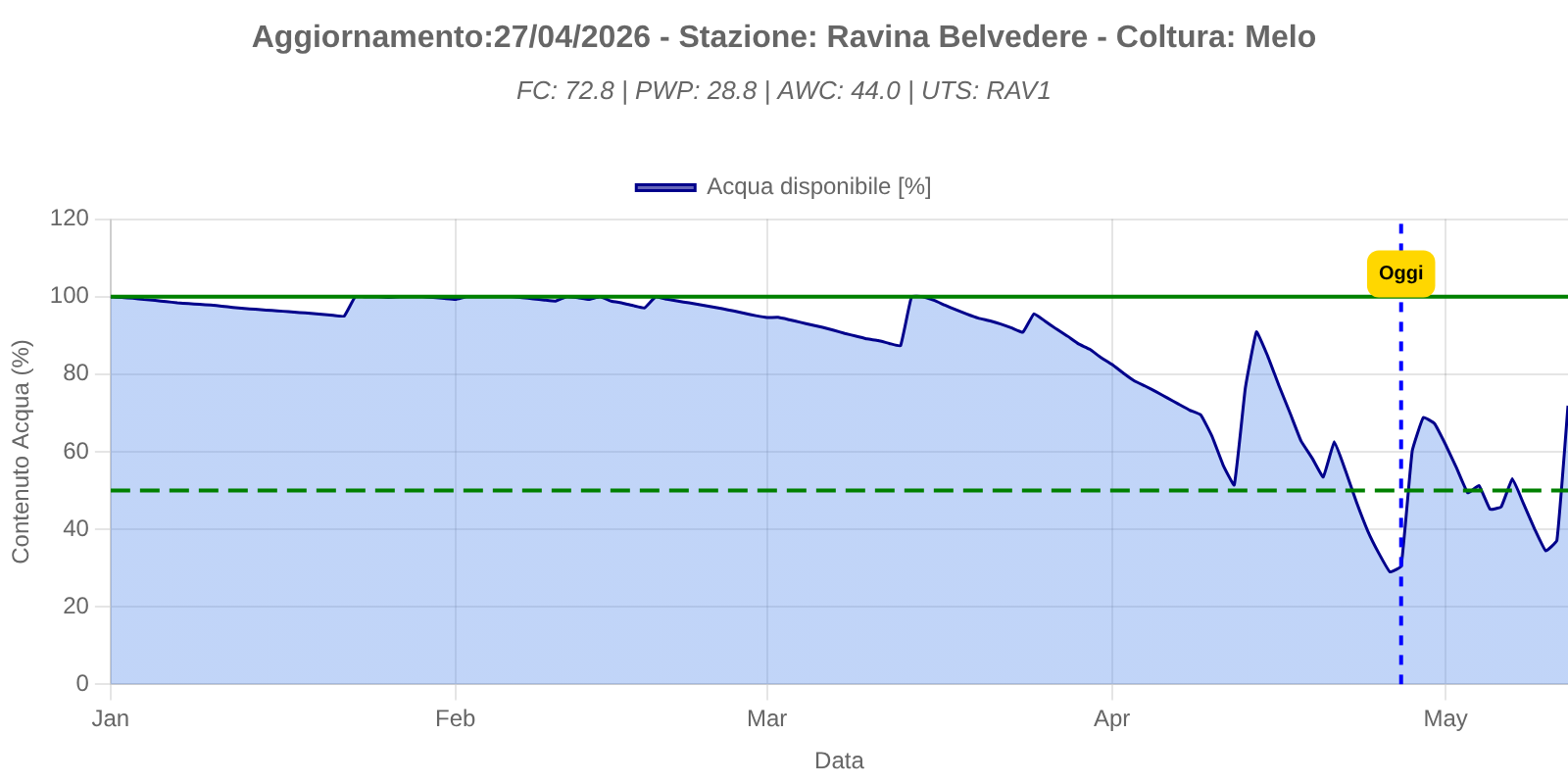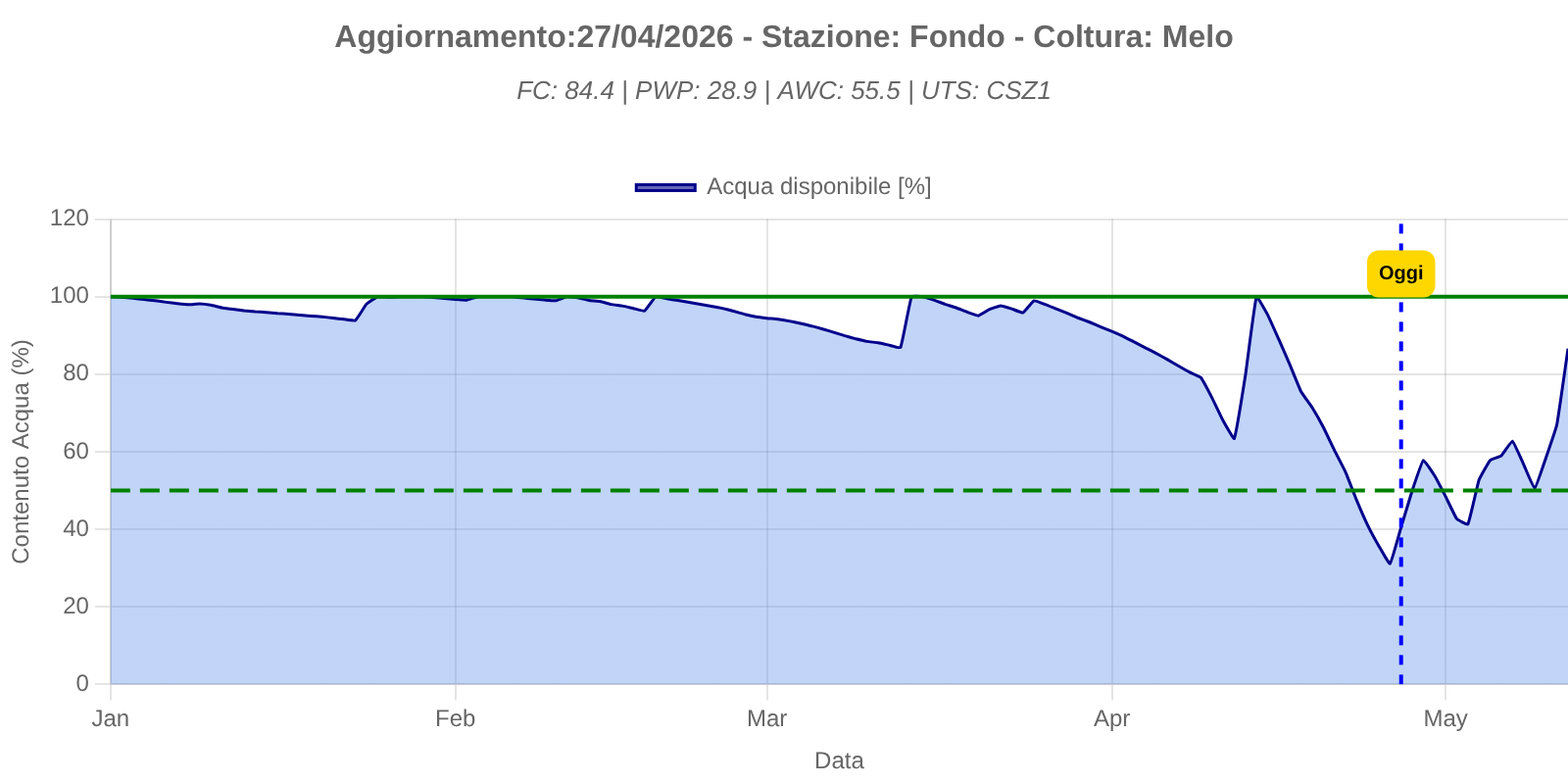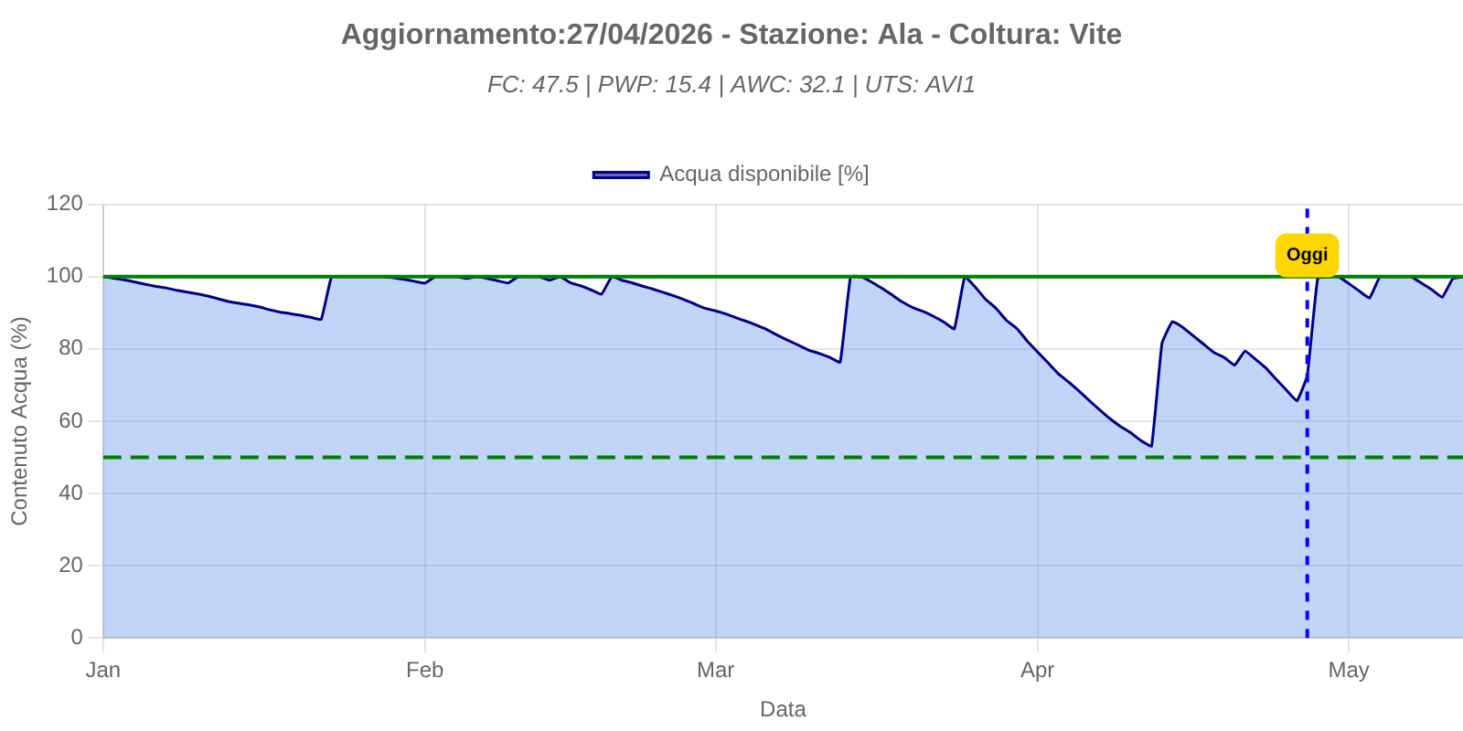 e utilizza, oltre ai dati meteorologici, anche le caratteristiche fisiche del suolo Per ogni stazione sono presenti due grafici che rappresentano la disponibilità d'acqua per due colture diverse (melo e vite)