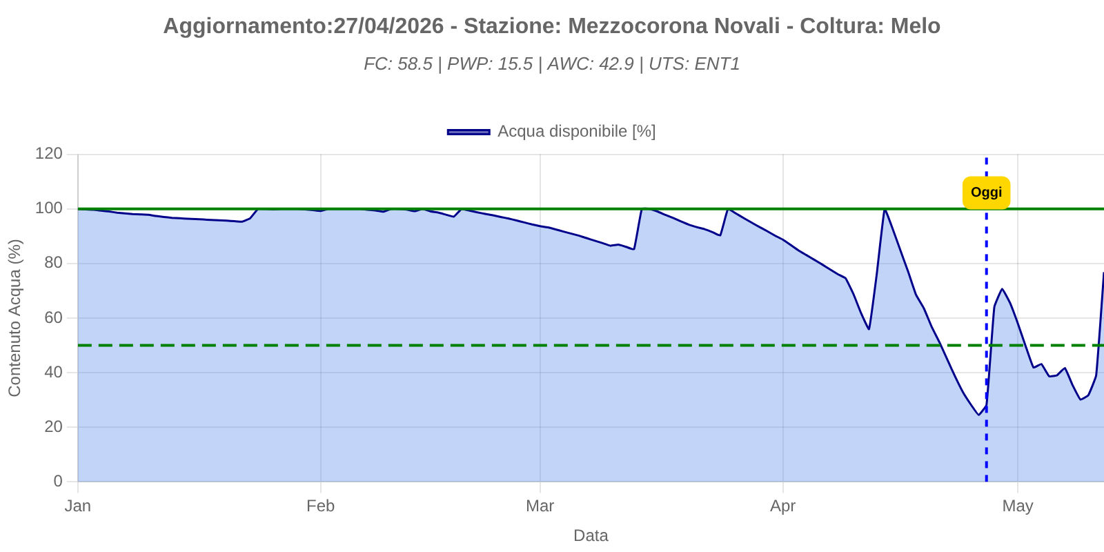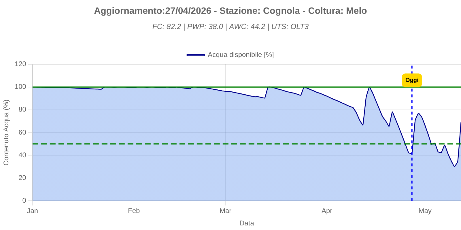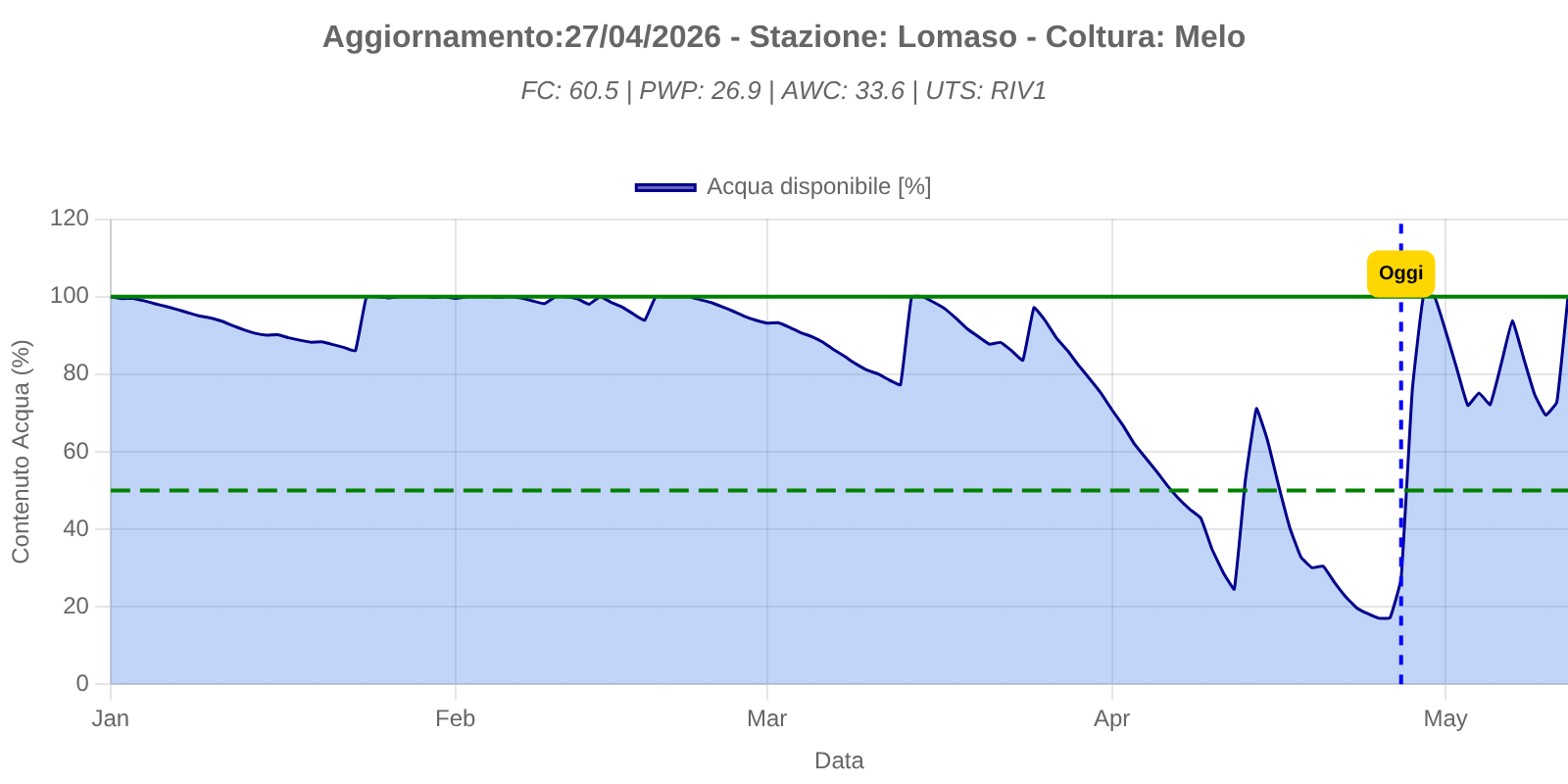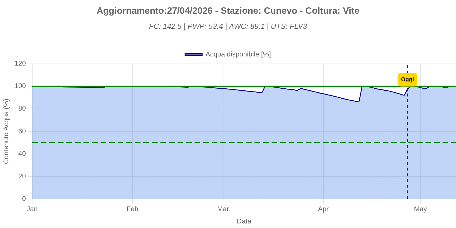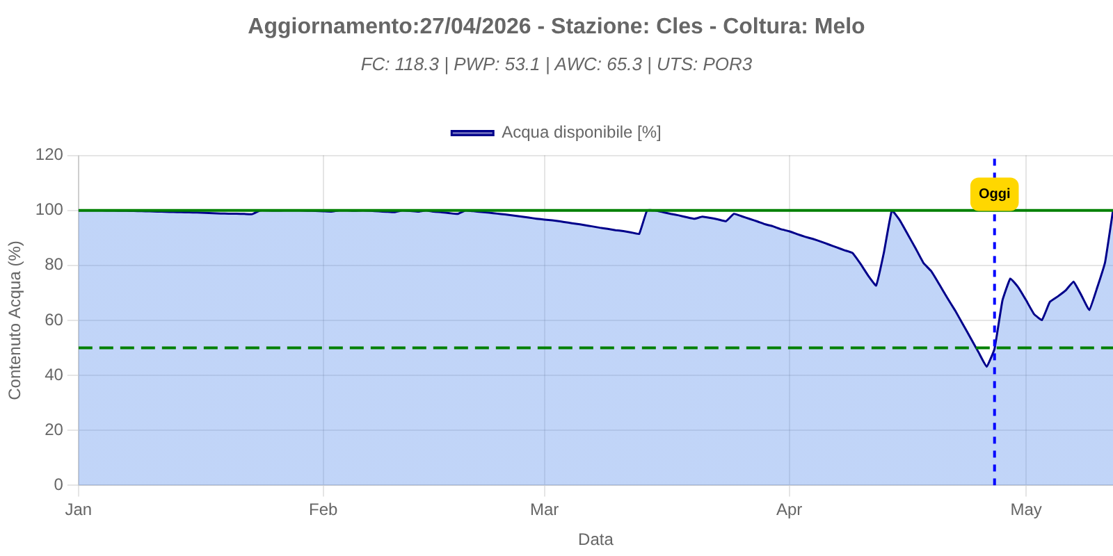 e utilizza, oltre ai dati meteorologici, anche le caratteristiche fisiche del suolo Per ogni stazione sono presenti due grafici che rappresentano la disponibilità d'acqua per due colture diverse (melo e vite)