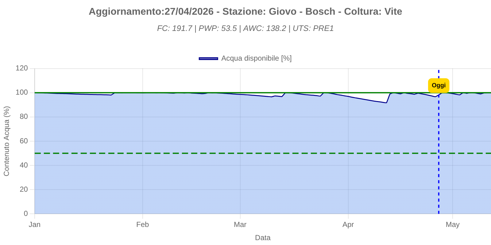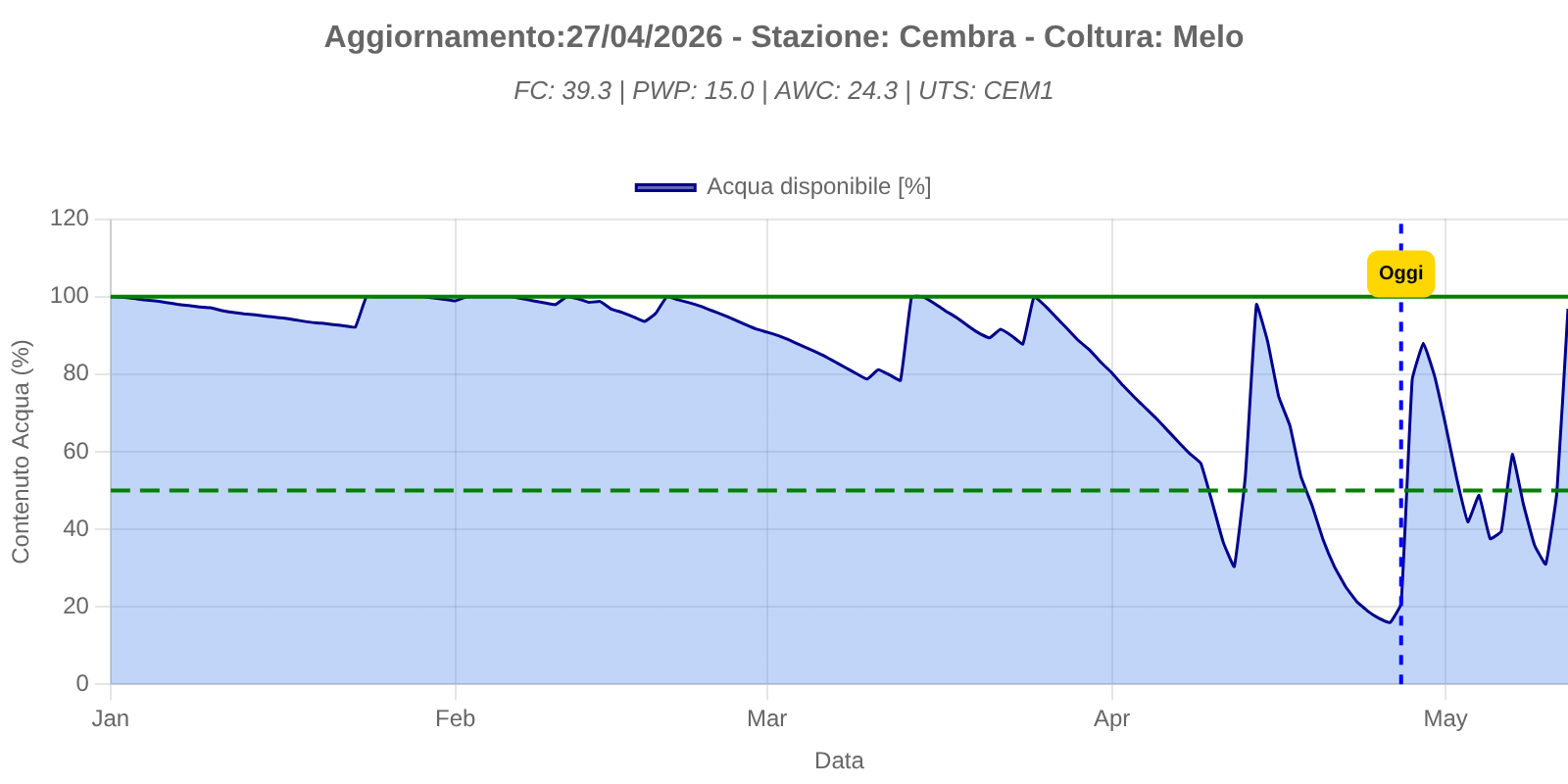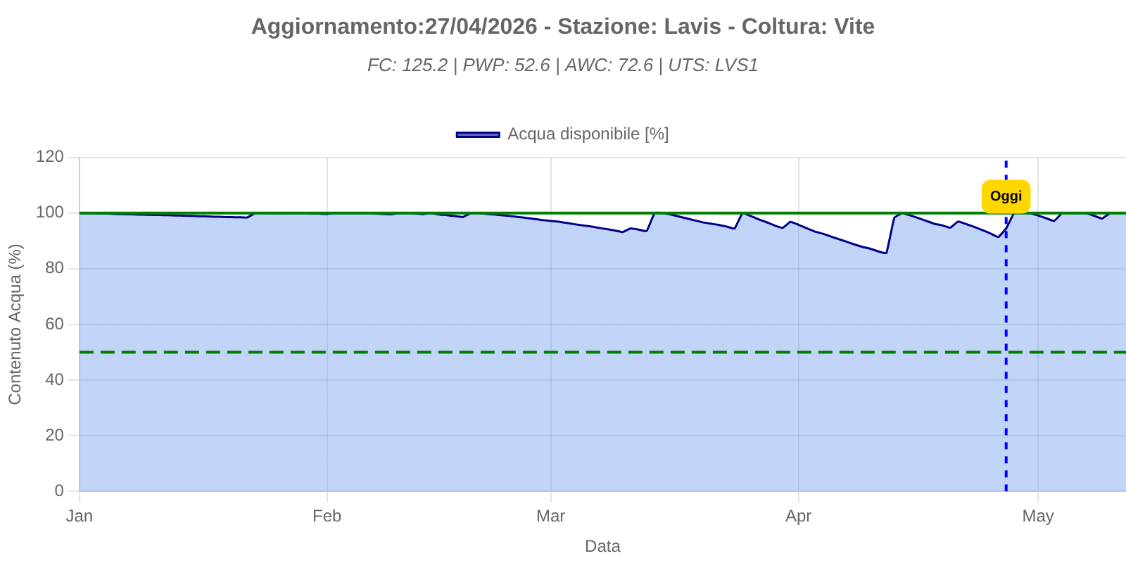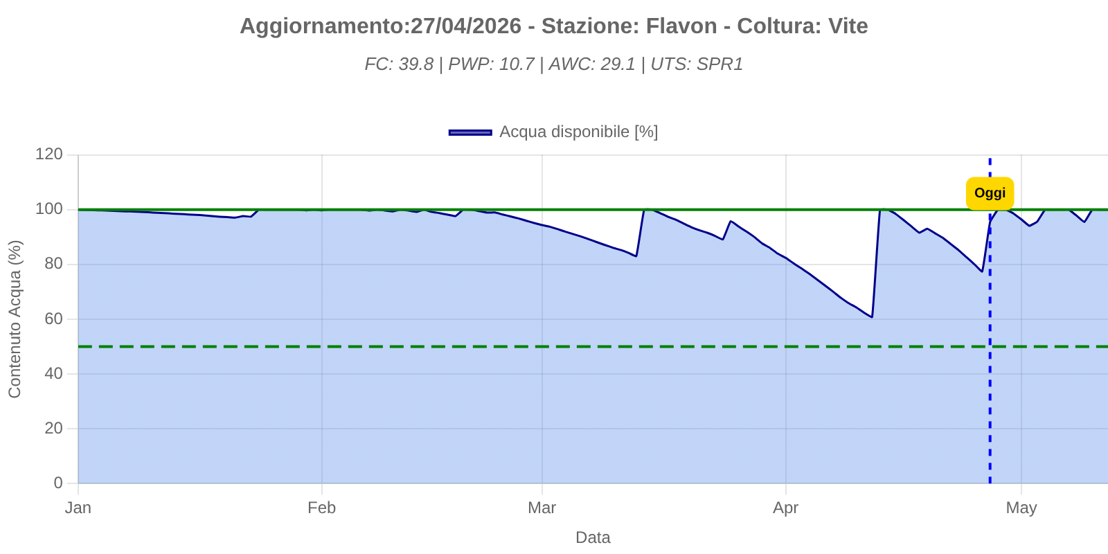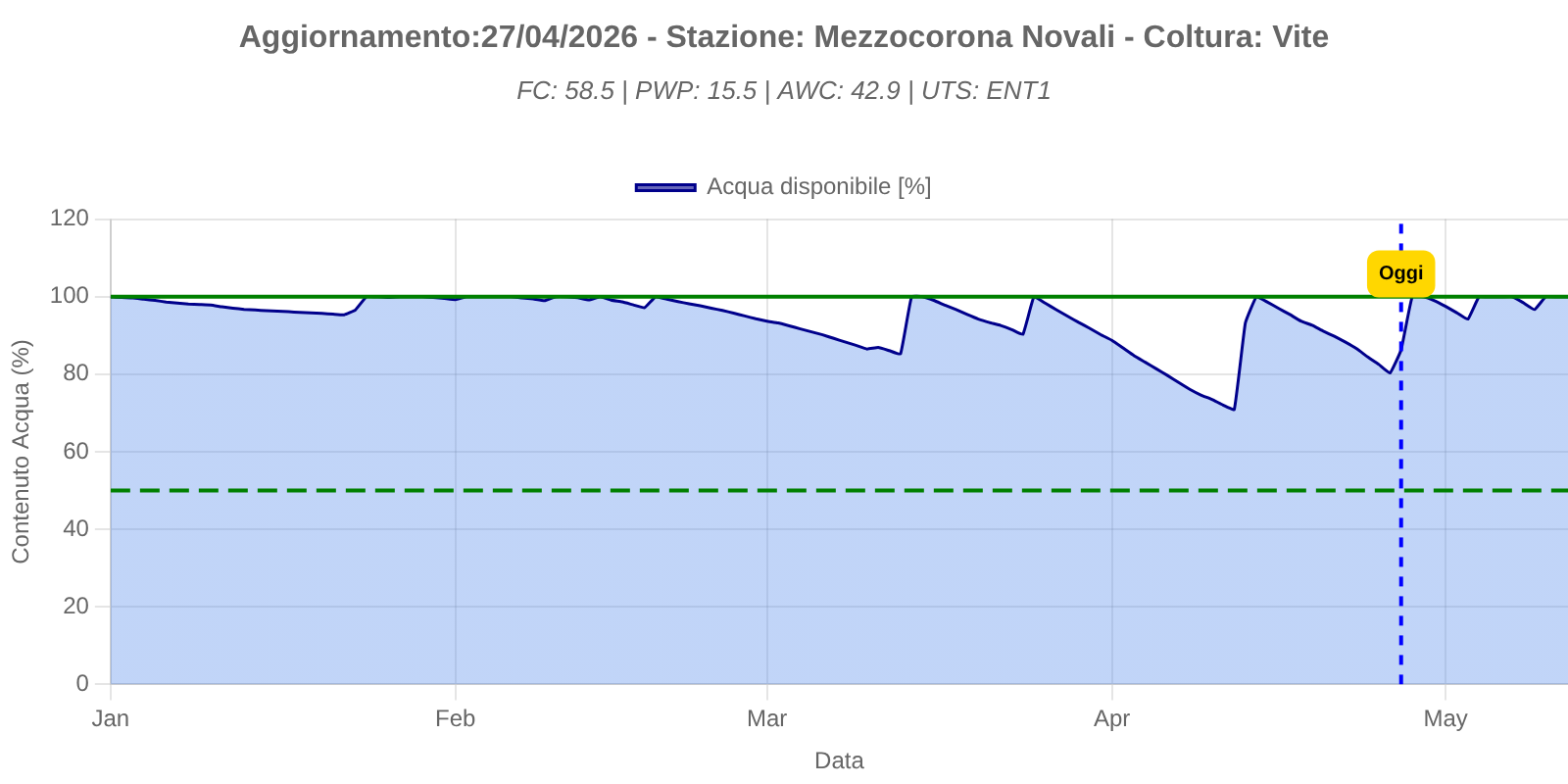 e utilizza, oltre ai dati meteorologici, anche le caratteristiche fisiche del suolo Per ogni stazione sono presenti due grafici che rappresentano la disponibilità d'acqua per due colture diverse (melo e vite)