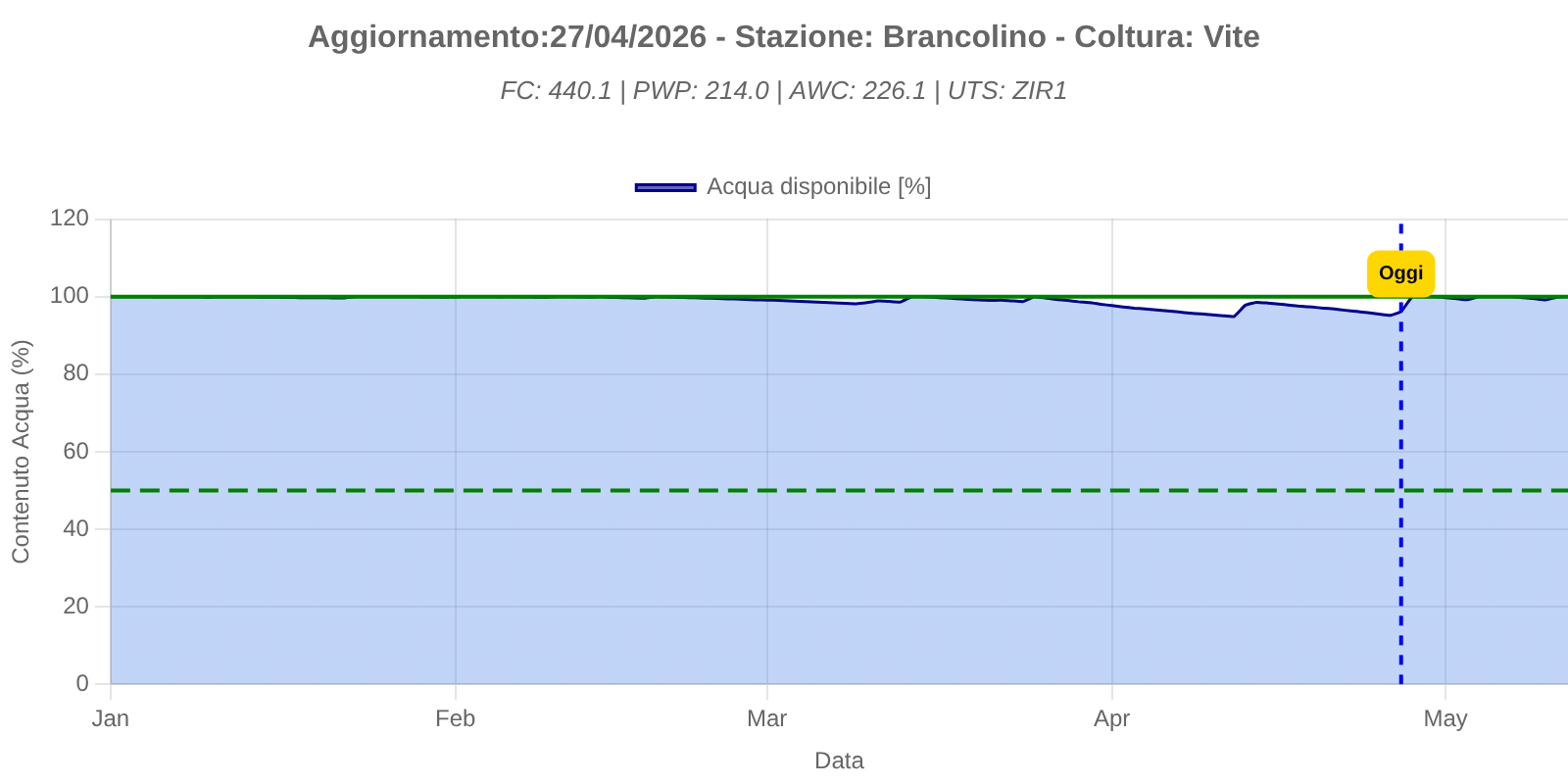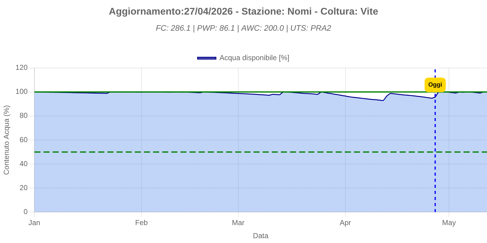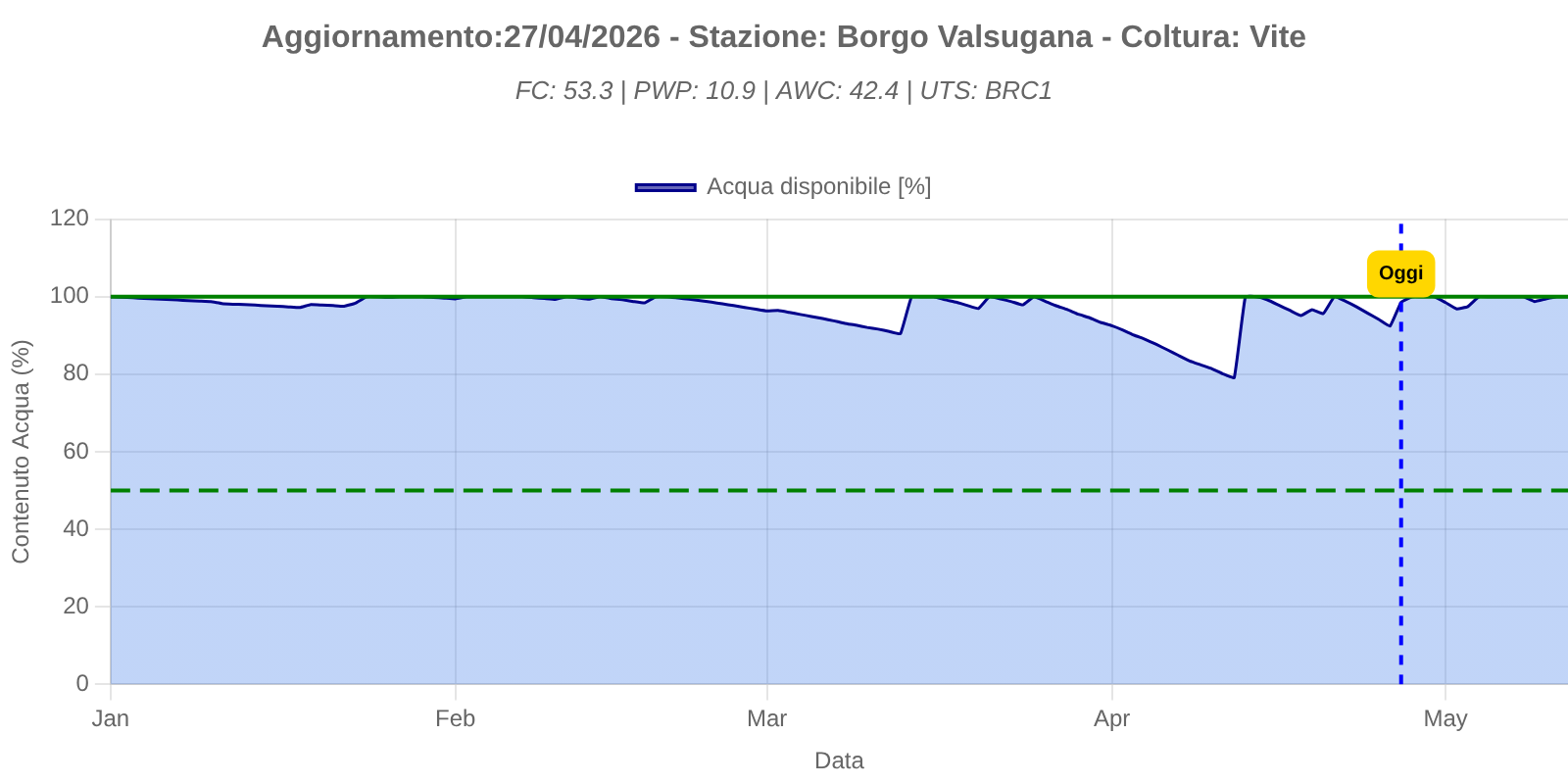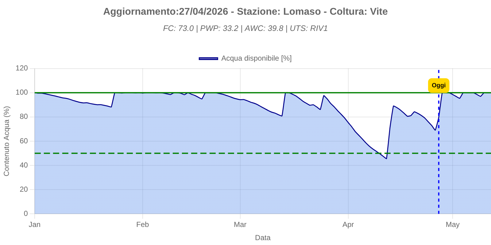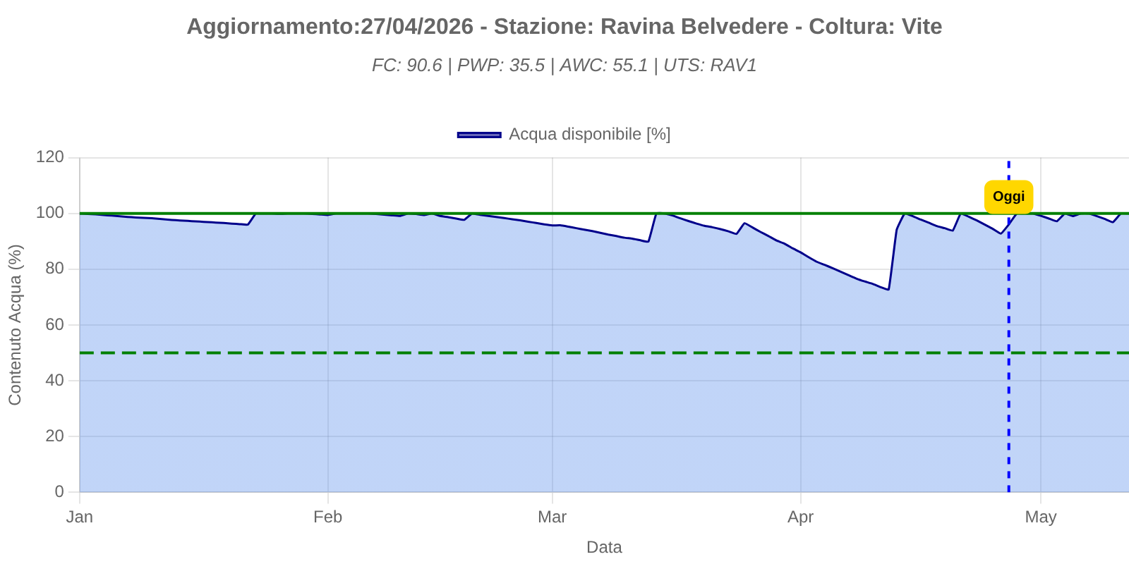 e utilizza, oltre ai dati meteorologici, anche le caratteristiche fisiche del suolo Per ogni stazione sono presenti due grafici che rappresentano la disponibilità d'acqua per due colture diverse (melo e vite)